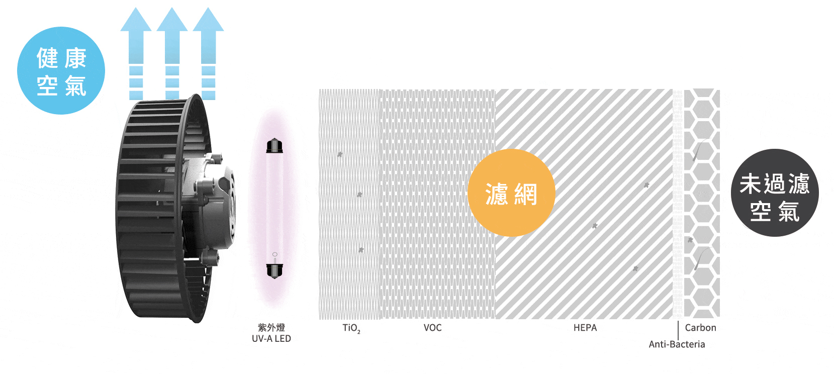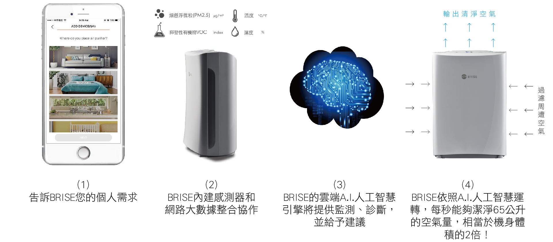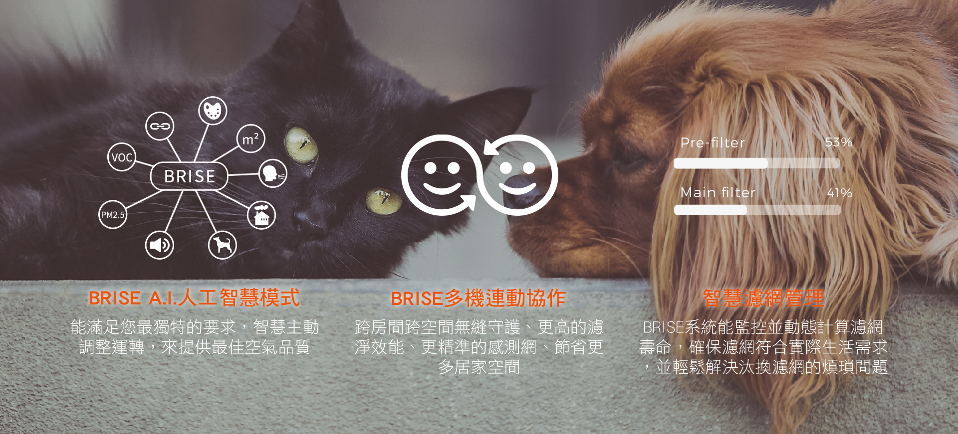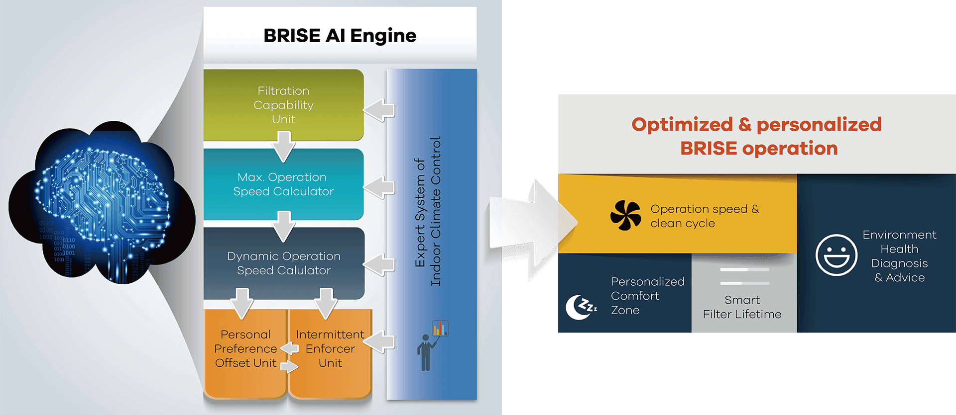 BRISE A.I.人工智慧引擎能隨時自動調整濾淨效率,同時兼顧「強效濾淨」、「省電節能」、「安靜舒適」三者的平衡點,確保您的環境潔淨舒適。
