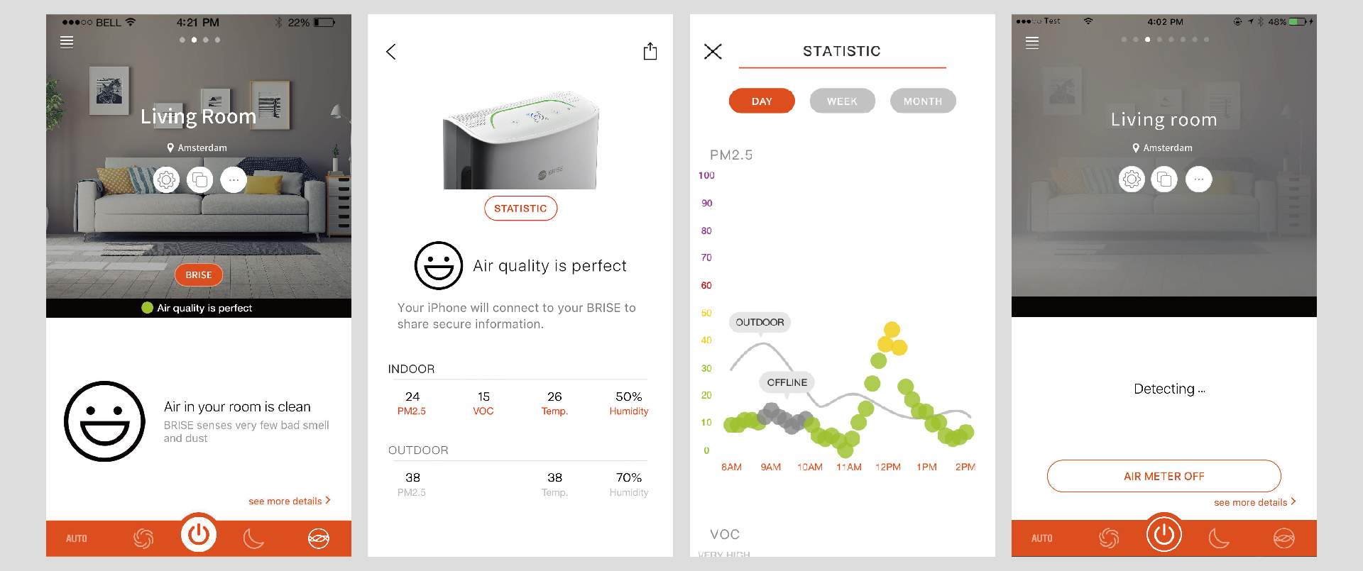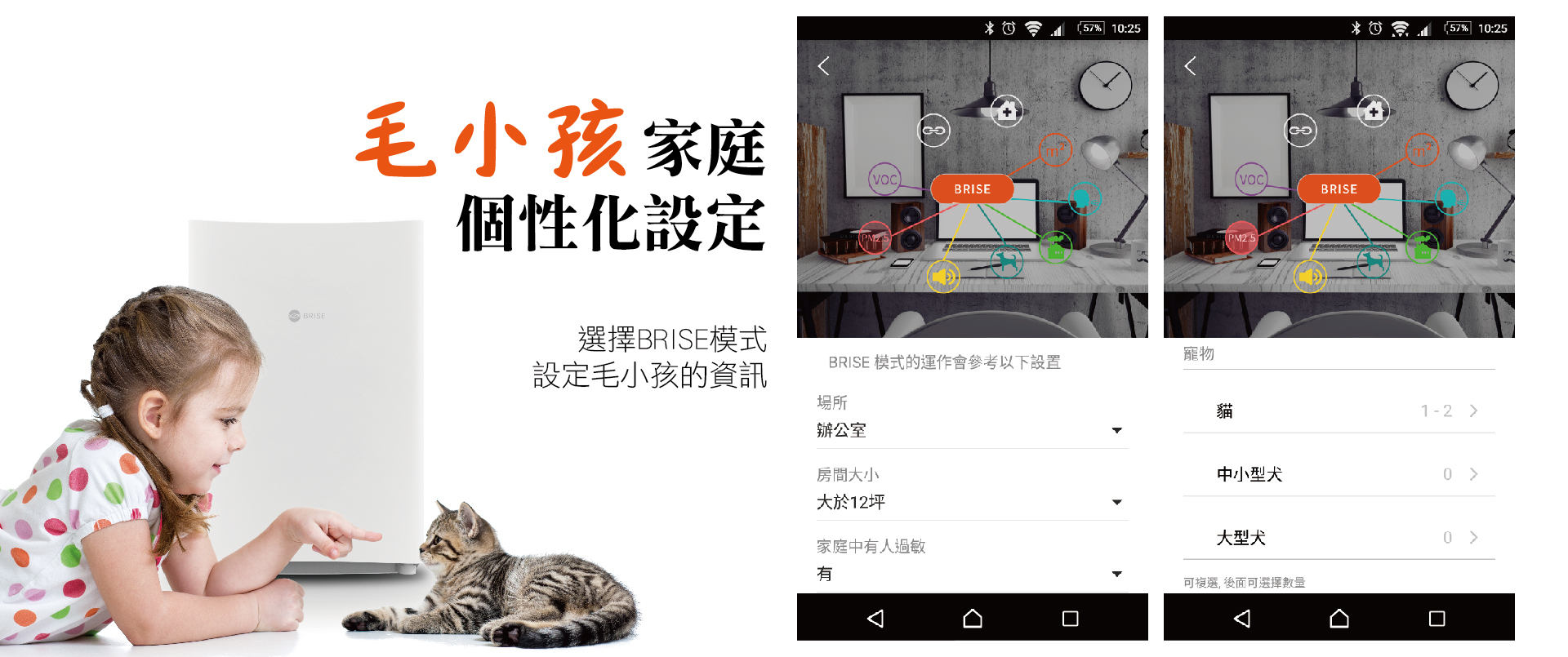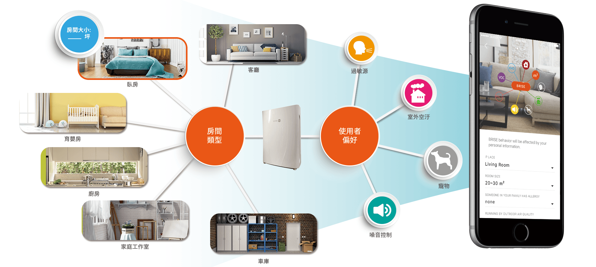 透過BRISE APP,輸入您的房間類型、大小、個人偏好(諸如寵物數量、過敏症狀、噪音容忍值)等條件,BRISE將自動學習並幫您打理一切。