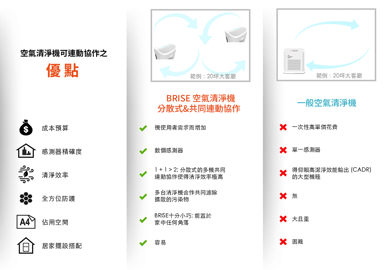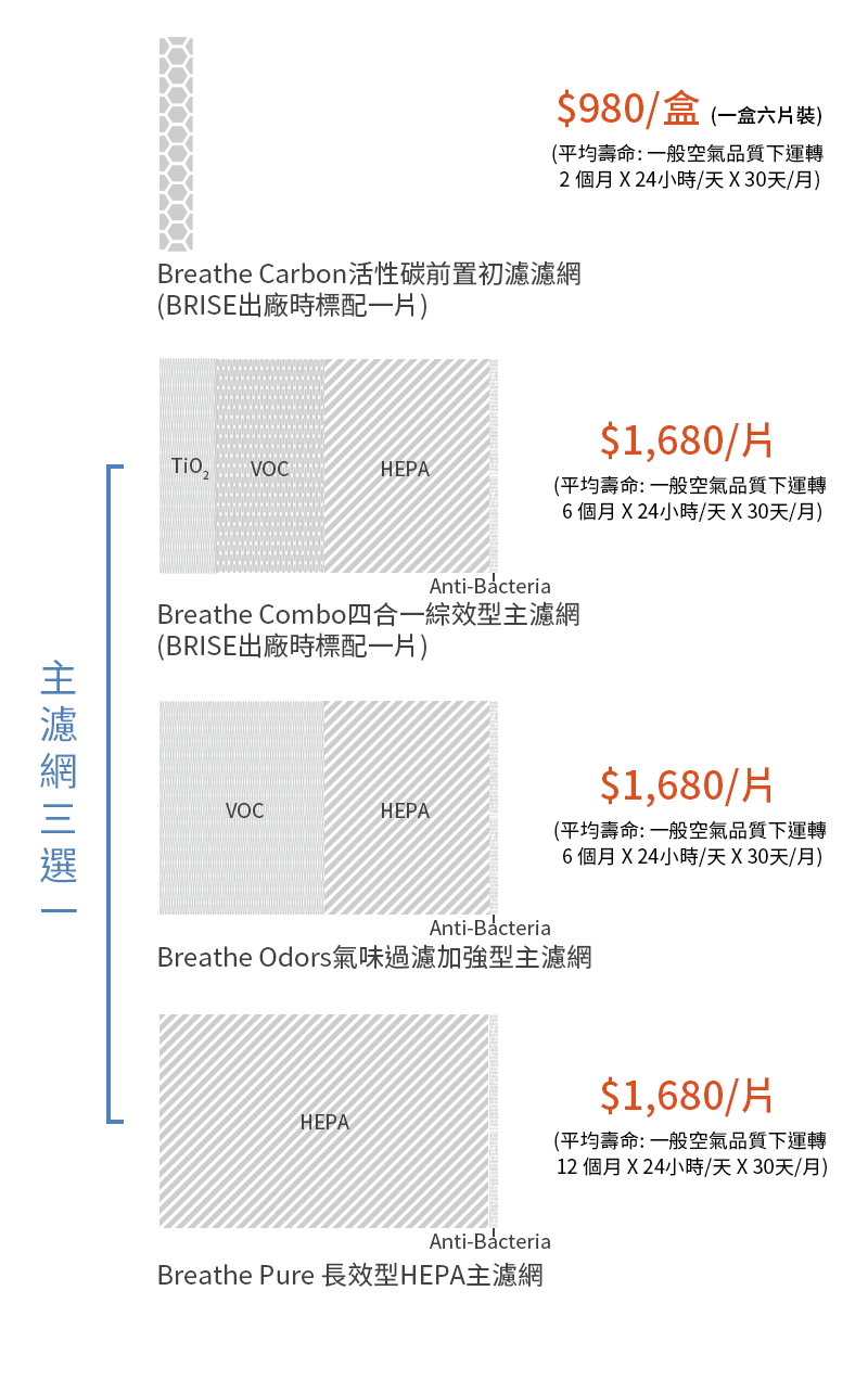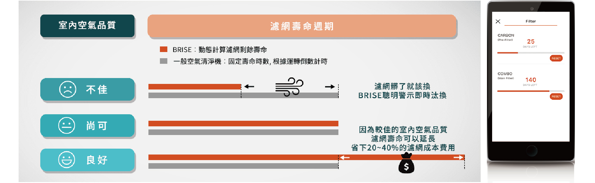 相較於其他傳統空氣清淨機的另一個不同點,BRISE濾網壽命並不是單純的倒數計時機制。它能根據實際使用時的運轉強弱、環境汙染物多寡、使用者生活型態等因素,來監控並動態計算濾網壽命,確保潔淨的空氣品質並避免不必要的濾網置換費用。