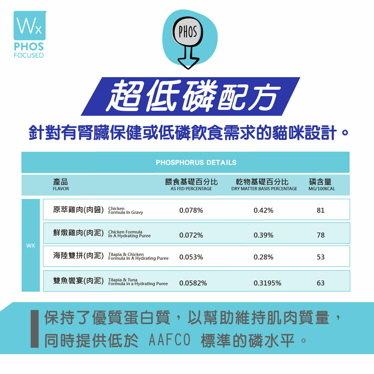 ◆超低含磷量;63mg/100大卡磷含量比AAFCO 最低標準減少 20%