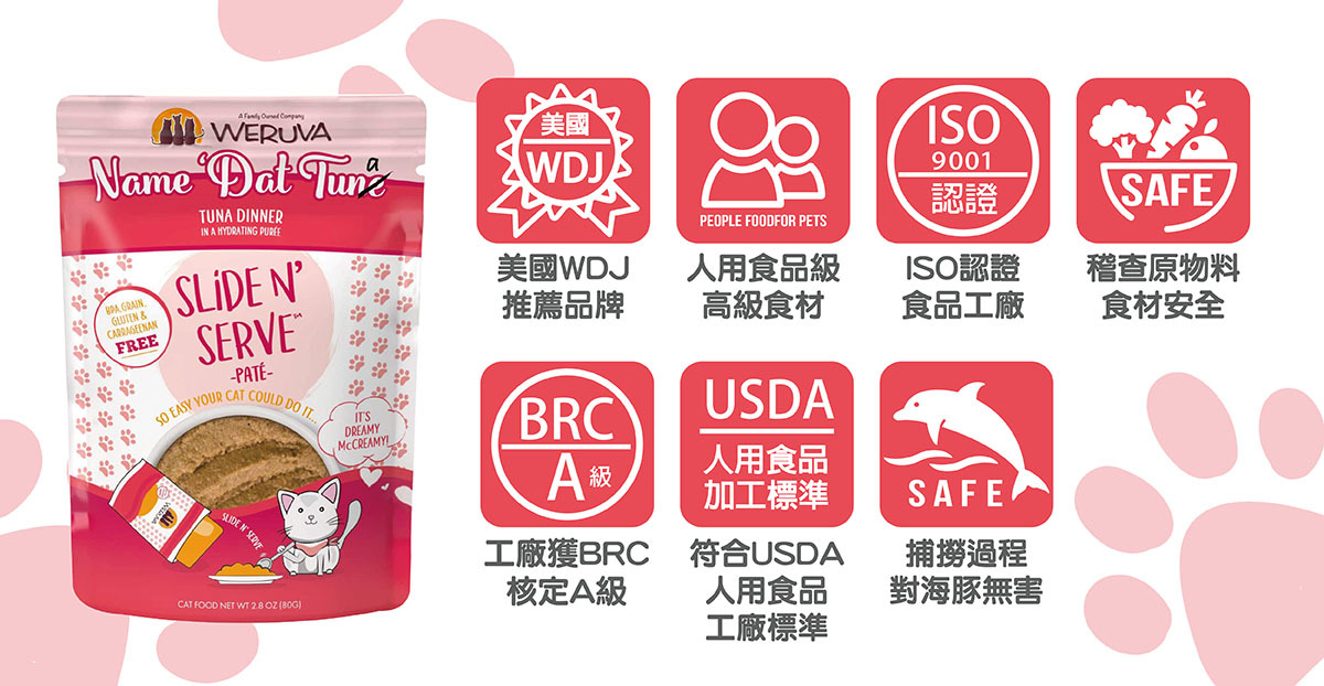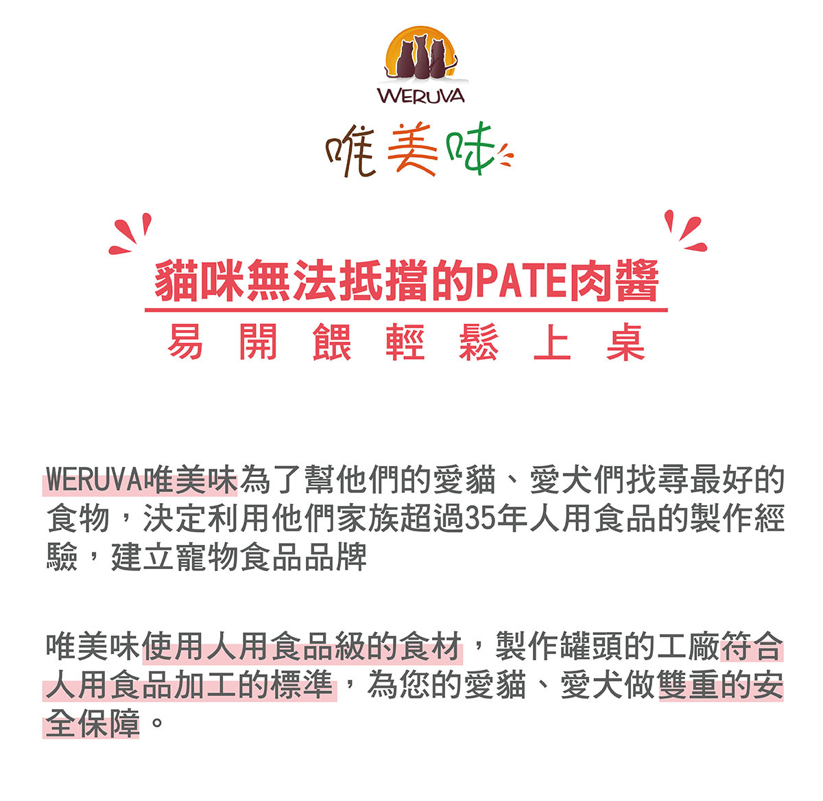 WERUVA唯美味,為了他們的愛貓、愛犬們找尋最好的食物,決定利用他們家族超過35年人用食品的製作經驗,建立愛貓、愛犬的食品品牌—唯美味WERUVA。唯美味使用人用食品級的食材,製作罐頭的工廠符合人用食品加工的標準,為您的愛貓、愛犬做雙重的安全保障。每一款口味,皆符合美國AAFCO訂定的成貓、成犬所需的營養標準,是您的寵物最佳主食選擇。