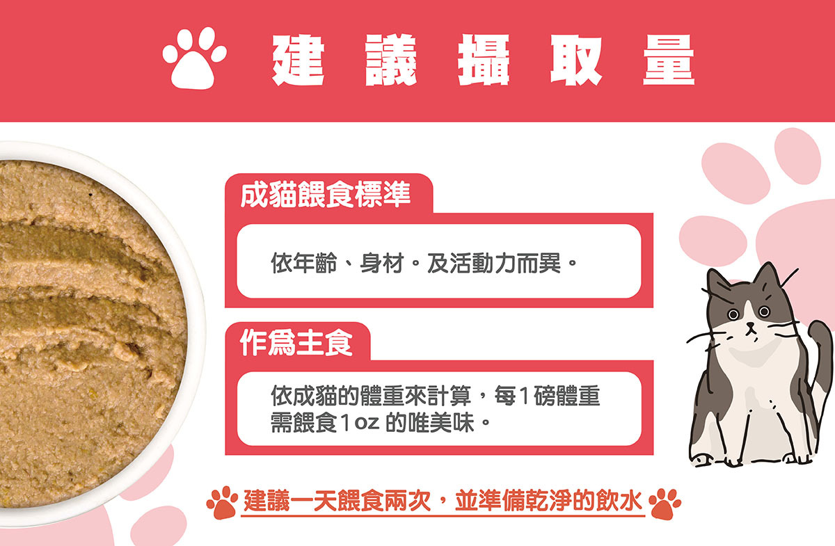 若作為主食,依成貓的體重來計算,每1磅(體重)需餵食1oz的唯美味。
