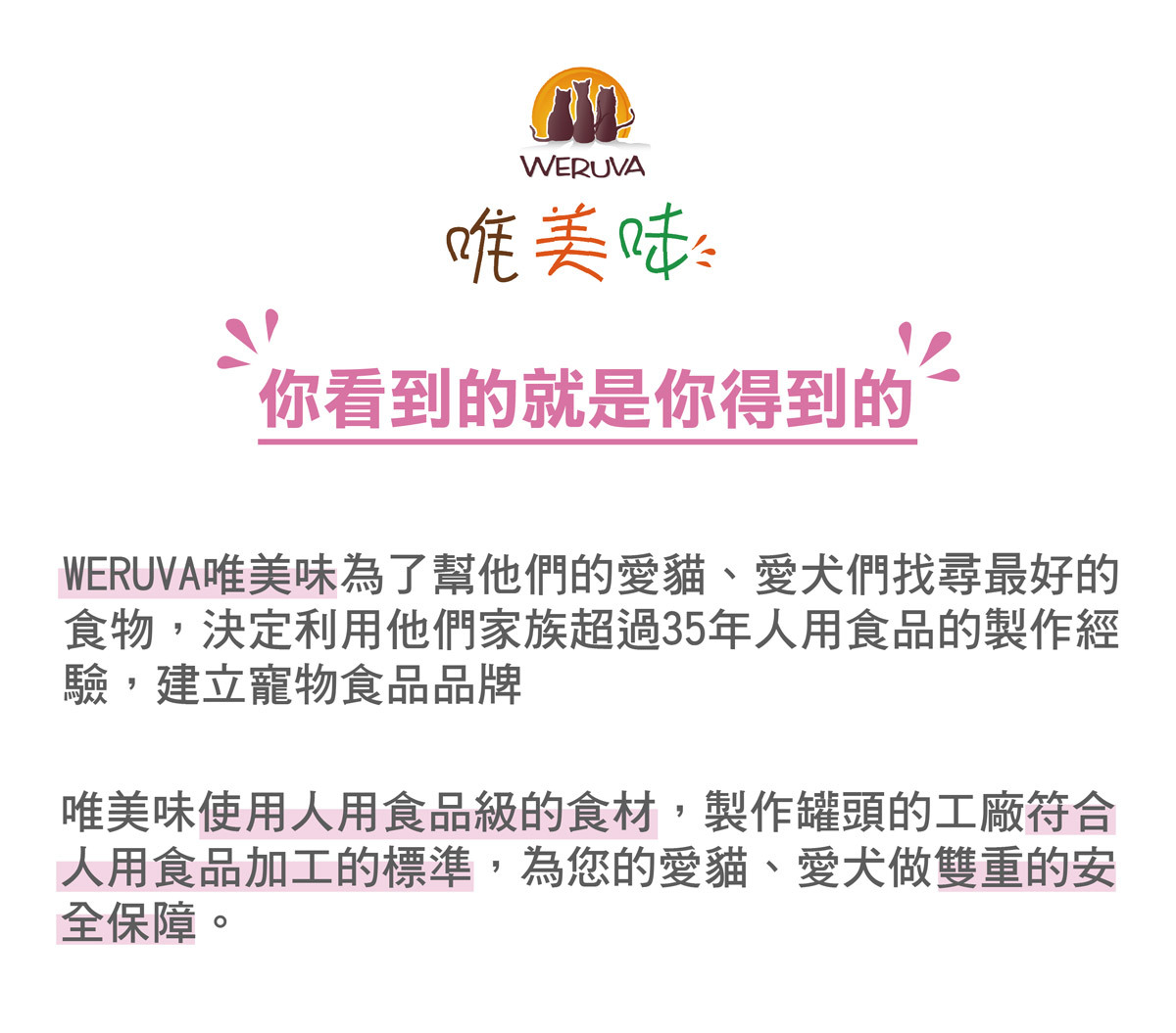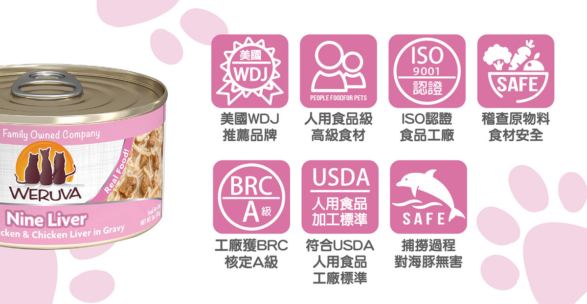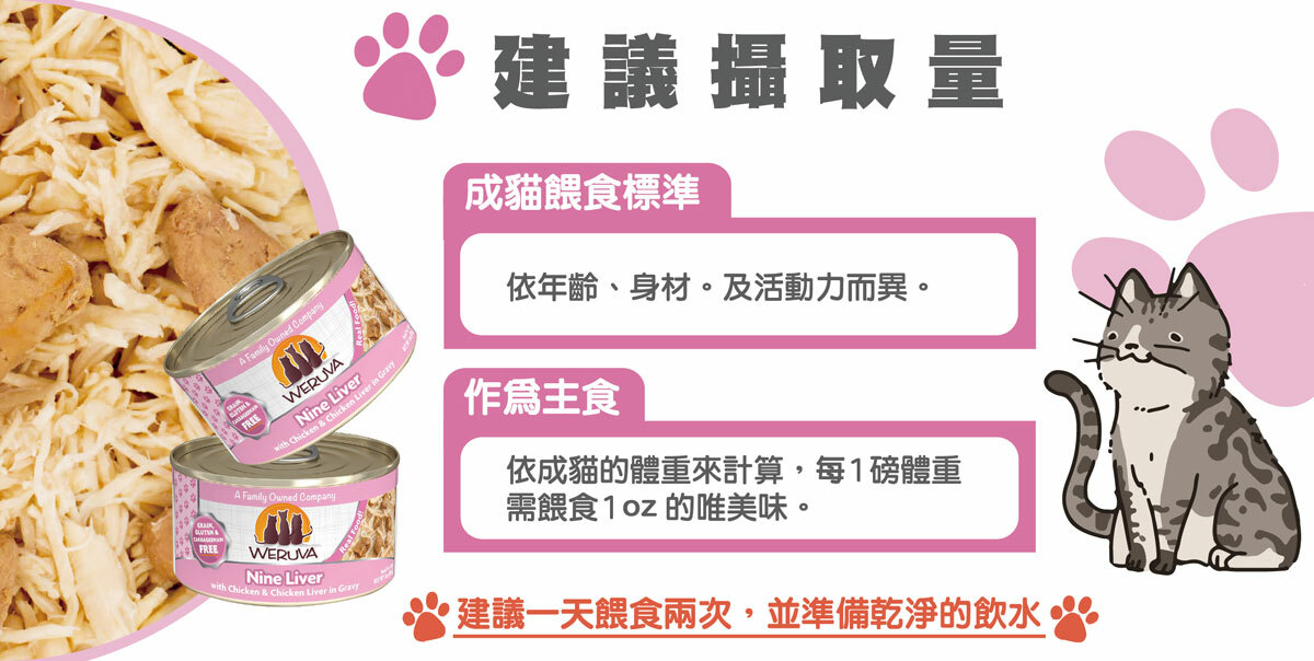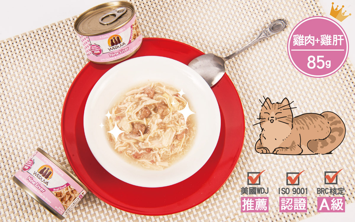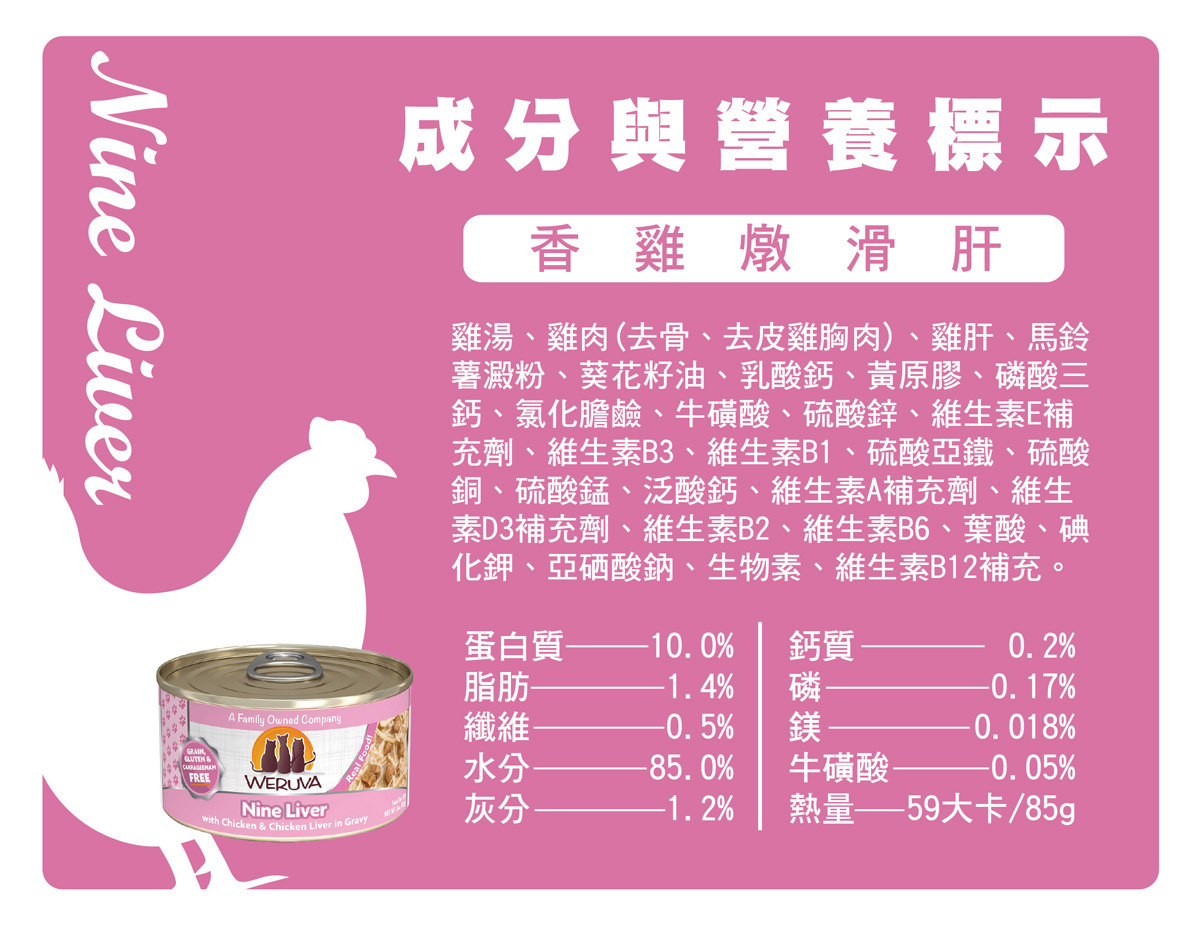 雞肉(去骨、去皮雞胸肉)、雞湯、雞肝、馬鈴薯澱粉、葵花籽油、乳酸鈣、黃原膠、磷酸三鈣、氯化膽鹼、牛磺酸、硫酸鋅、維生素E補充劑、維生素B3、維生素B1、硫酸亞鐵、硫酸銅、硫酸錳、泛酸鈣、維生素A補充劑、維生素D3補充劑、維生素B2、維生素B6、葉酸、碘化鉀、亞硒酸鈉、生物素、維生素B12補充。