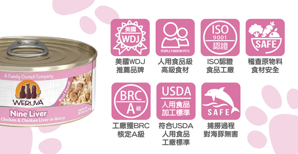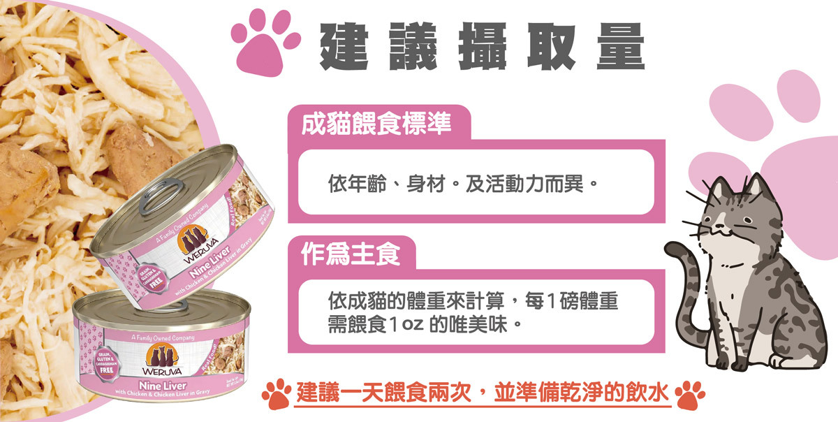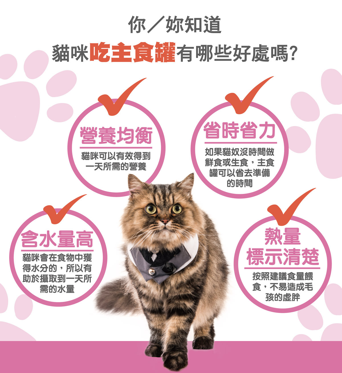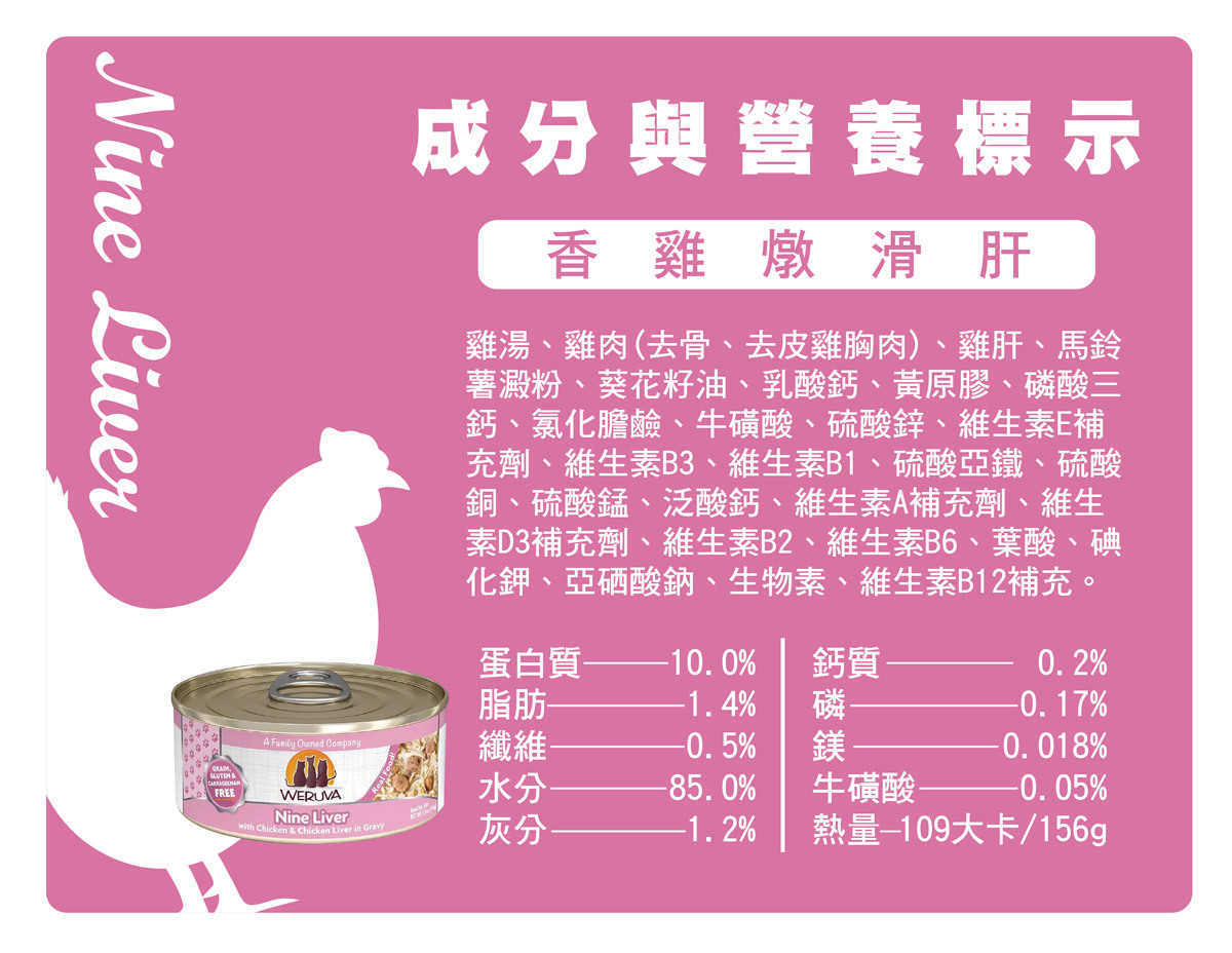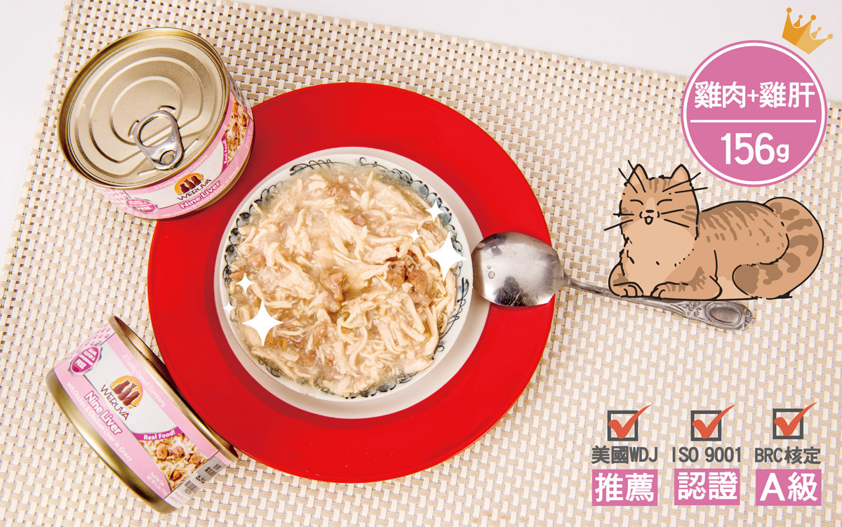 雞肉(去骨、去皮雞胸肉)、雞湯、雞肝、馬鈴薯澱粉、葵花籽油、乳酸鈣、黃原膠、磷酸三鈣、氯化膽鹼、牛磺酸、硫酸鋅、維生素E補充劑、維生素B3、維生素B1、硫酸亞鐵、硫酸銅、硫酸錳、泛酸鈣、維生素A補充劑、維生素D3補充劑、維生素B2、維生素B6、葉酸、碘化鉀、亞硒酸鈉、生物素、維生素B12補充。