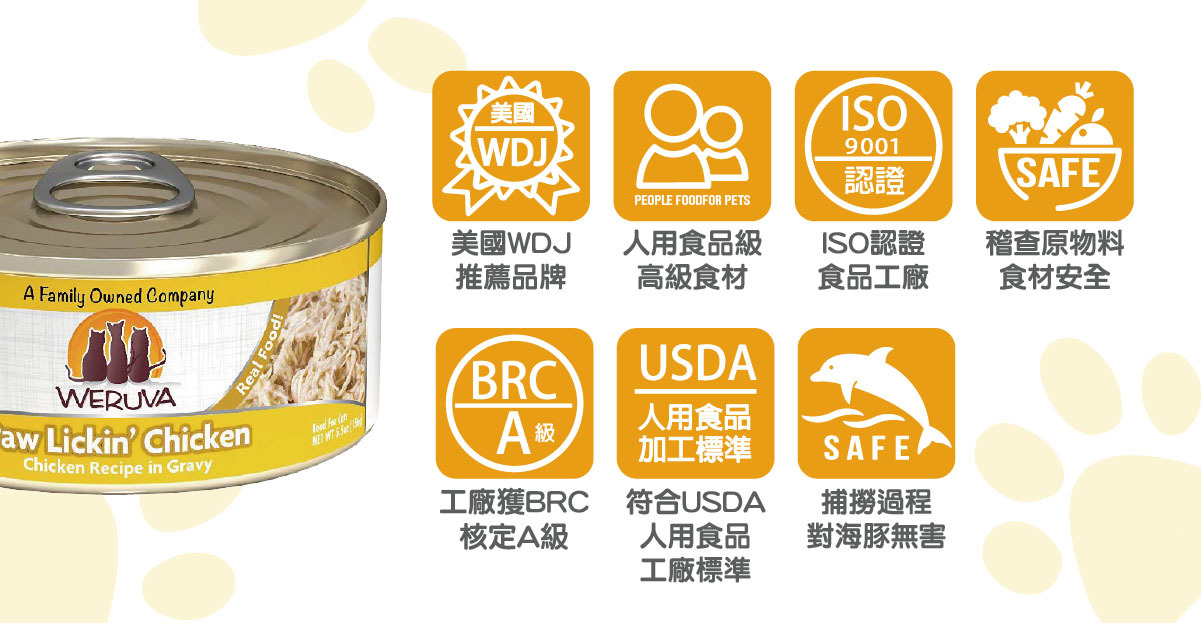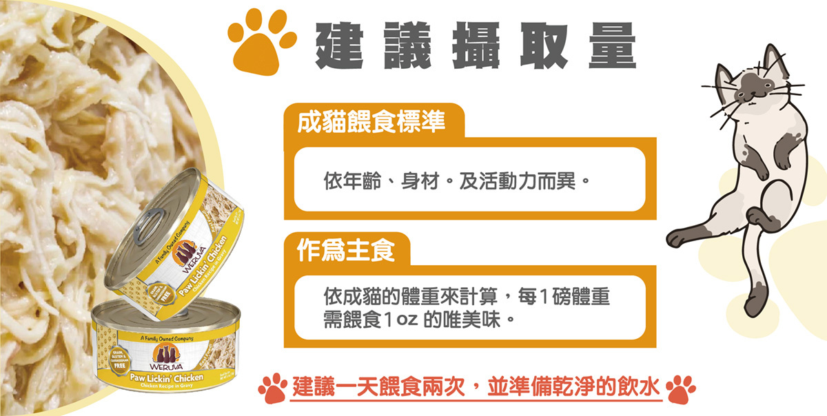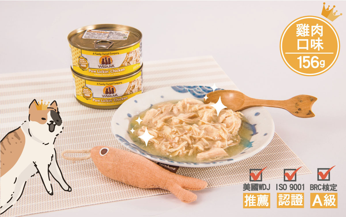 雞肉(去骨、去皮雞胸肉)、雞湯、馬鈴薯澱粉、葵花籽油、乳酸鈣、黃原膠、磷酸三鈣、氯化膽鹼、牛磺酸、硫酸鋅、維生素E補充劑、硫酸亞鐵、維生素B3、維生素B1、泛酸鈣、硫酸銅、維生素B2、維生素B6、維生素A補充劑、硫酸錳、維生素D3補充劑、葉酸、碘化鉀、亞硒酸鈉、生物素、維生素B12補充劑。