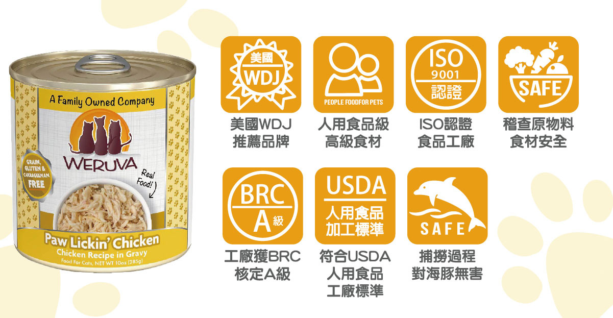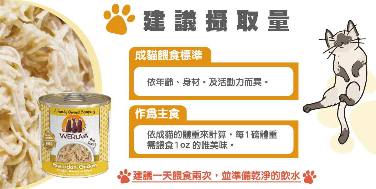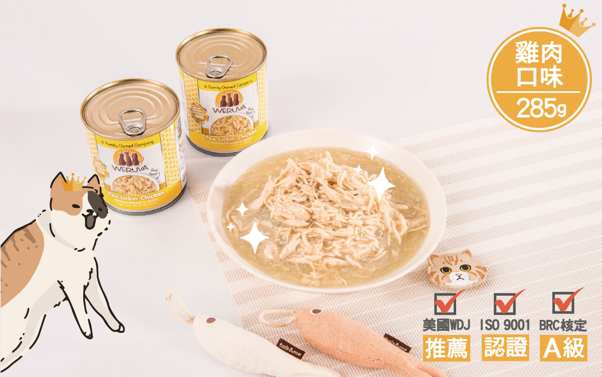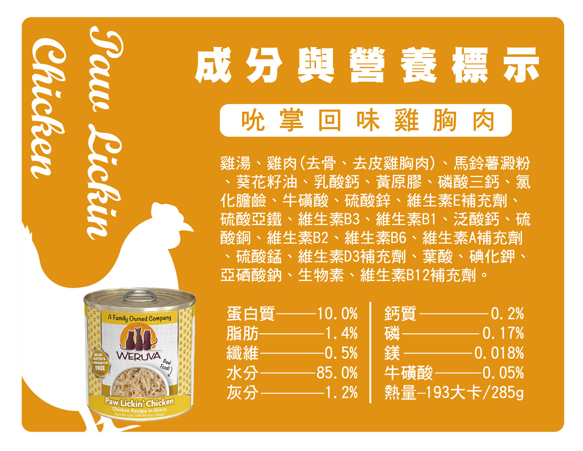 雞肉(去骨、去皮雞胸肉)、雞湯、馬鈴薯澱粉、葵花籽油、乳酸鈣、黃原膠、磷酸三鈣、氯化膽鹼、牛磺酸、硫酸鋅、維生素E補充劑、硫酸亞鐵、維生素B3、維生素B1、泛酸鈣、硫酸銅、維生素B2、維生素B6、維生素A補充劑、硫酸錳、維生素D3補充劑、葉酸、碘化鉀、亞硒酸鈉、生物素、維生素B12補充劑。
