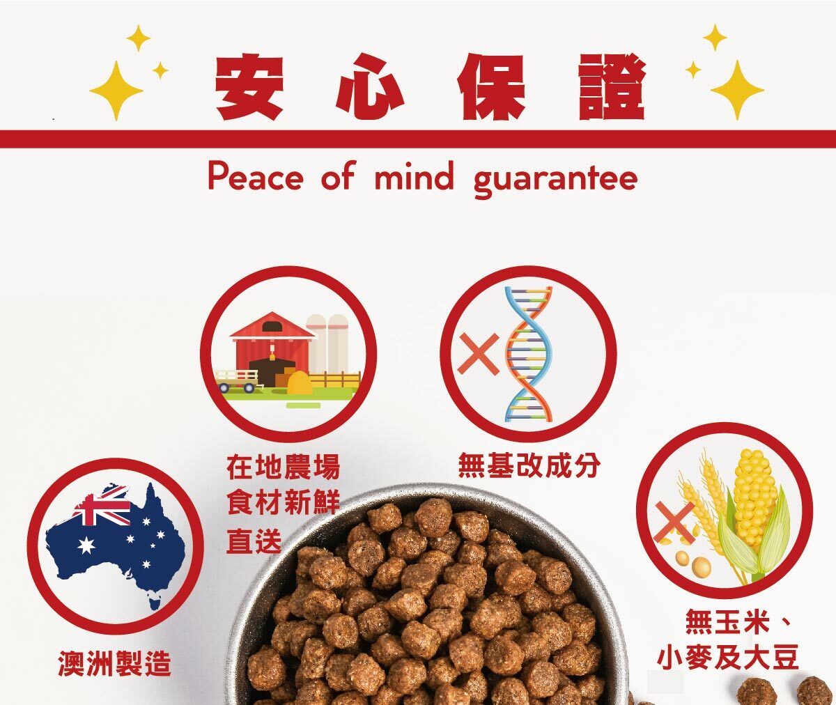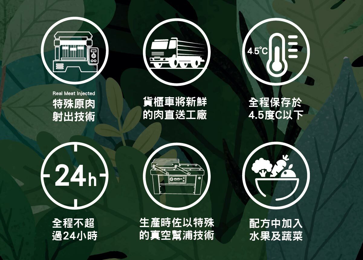 Real Meat Injected 特殊原肉射出技術,我們用冷凍貨櫃車將新鮮的肉從昆士蘭工廠運送到乾糧工廠,這些新鮮的肉原料全程保存於4.5度C以下的冷櫃中,且全程不超過24小時, 於生產時佐以特殊的真空幫浦技術將這些新鮮的肉泥打入預先混合的原料中,此一特殊製程技術使得我們的產品有更佳的嗜口性。