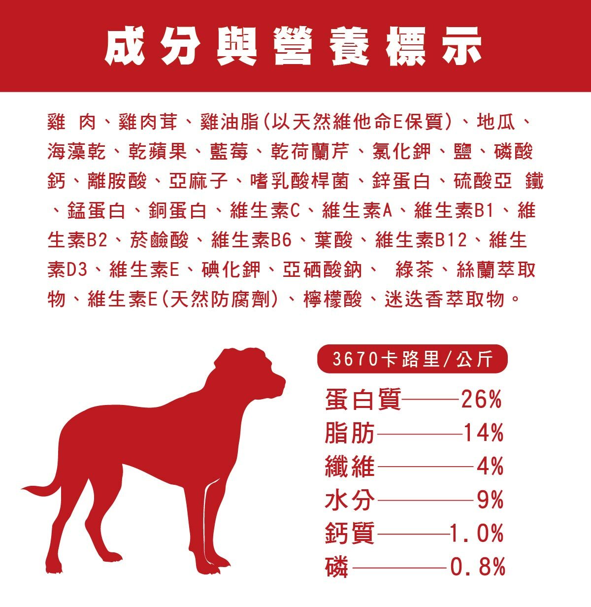 雞 肉、雞肉茸、雞油脂(以天然維他命E保質)、地瓜、海藻乾、乾蘋果、藍莓、乾荷蘭芹、氯化鉀、鹽、磷酸鈣、離胺酸、亞麻子、嗜乳酸桿菌、鋅蛋白、硫酸亞 鐵、錳蛋白、銅蛋白、維生素C、維生素A、維生素B1、維生素B2、菸鹼酸、維生素B6、葉酸、維生素B12、維生素D3、維生素E、碘化鉀、亞硒酸鈉、 綠茶、絲蘭萃取物、維生素E(天然防腐劑)、檸檬酸、迷迭香萃取物。
